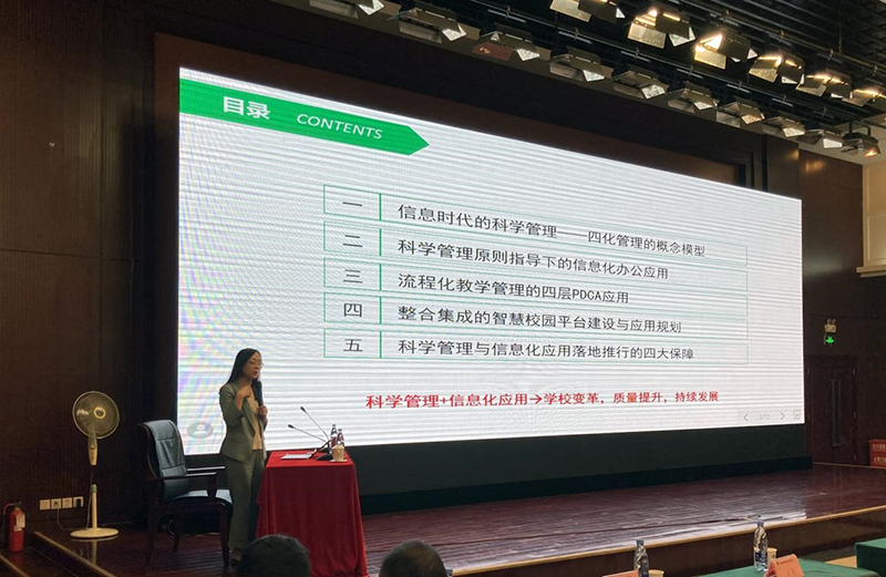 在下午的專題講座環(huán)節(jié),依能職業(yè)教育研究所研究員、成都依能科技股份有限公司總經(jīng)理顏慶作了題為《以信息化應用賦能學??茖W管理》的專家報告,從四化管理的概念模型、科學管理原則指導下的信息化辦公應用、流程化教學管理的四層PDCA應用、整合集成的智慧校園平臺建設與應用規(guī)劃、科學管理與信息化應用落地推行的四大保障五個方面詳細闡述了以信息化賦能學??茖W管理的內涵、實施方式和支撐工具。