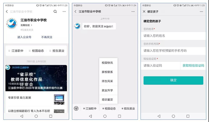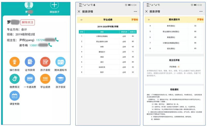 家長通過關(guān)注學(xué)校微信公眾號,填寫預(yù)留在學(xué)校的手機號碼綁定自己的孩子,即可實時查看孩子在校各方面的表現(xiàn)情況,如孩子的操行表現(xiàn)、獲獎證書、請假情況、繳費情況、一卡通消費、學(xué)業(yè)成績、課堂考勤等,家長還可以在線收取學(xué)生的期末通知書等,讓家校溝通無障礙、精準(zhǔn)、高效。
