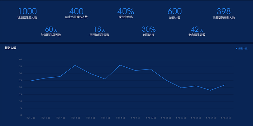 在招生與新生報到時,學(xué)校領(lǐng)導(dǎo)關(guān)心這些問題:招生整體進度怎么樣?各個生源學(xué)校報名情況如何?每日有多少意向報名登記情況?當(dāng)天已報到新生有多少?各專業(yè)累計報到情況怎樣?……在過去,晉江安海職業(yè)中專學(xué)校采用從下到上逐一口頭匯總數(shù)據(jù)的方式,由于數(shù)據(jù)匯總與匯報主要依靠人,工作量大,容易出錯,導(dǎo)致對整個招生過程的監(jiān)控預(yù)測不準(zhǔn)確?,F(xiàn)在,采用信息化看板后,學(xué)校領(lǐng)導(dǎo)利用電視看板在辦公室就可對當(dāng)前招生完成率、報名人數(shù)、錄取人數(shù)、到校報到人數(shù)、新生費用繳納情況做全面的掌控,各專業(yè)報名錄取情況實時對比分析,為學(xué)校專業(yè)間學(xué)生調(diào)整、報讀引導(dǎo)提供預(yù)警功能。通過近5年招生情況的實時對比,提前發(fā)現(xiàn)招生問題風(fēng)險,以便即時啟動招生應(yīng)急預(yù)案,確保全年招生任務(wù)的完成。