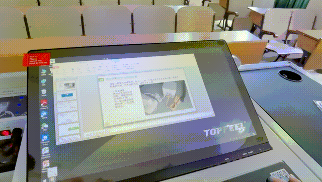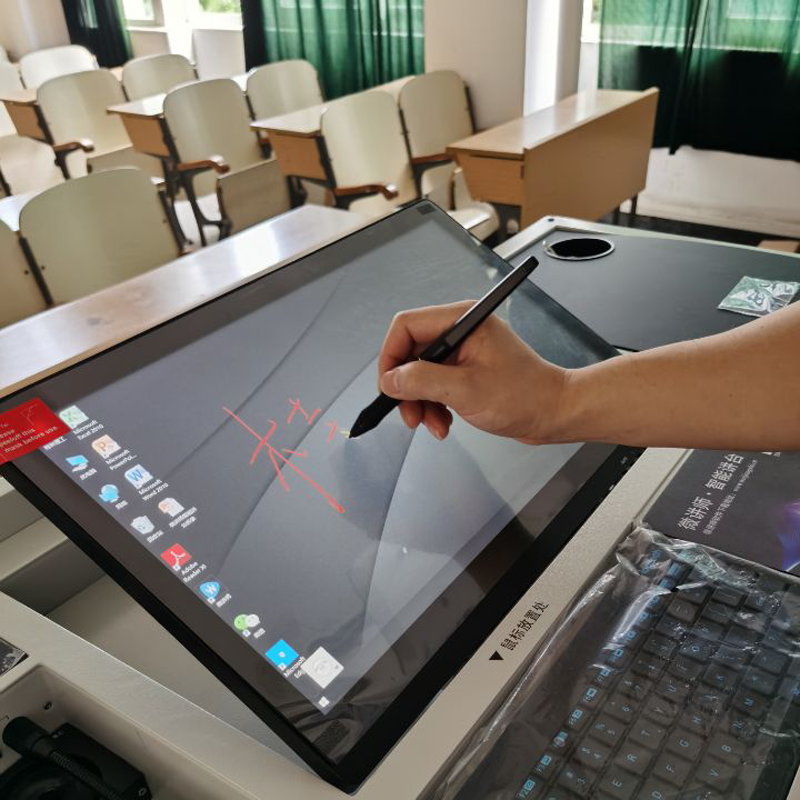 授課電腦屏幕可觸屏控制,也可直接在屏幕上書寫,還可手動調(diào)節(jié)書寫屏角度,讓不同身高老師的書寫體驗最佳: