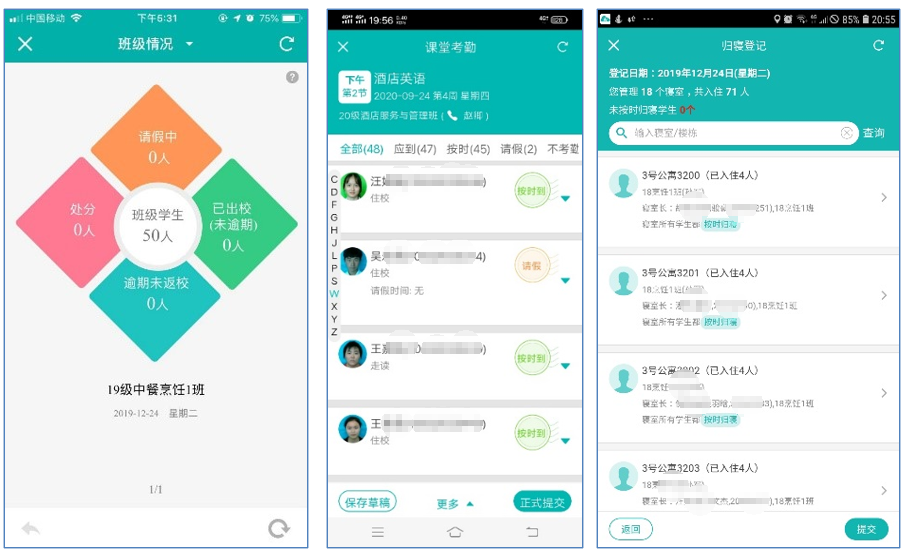學(xué)生日常請(qǐng)假、銷假業(yè)務(wù)處理,傳統(tǒng)紙質(zhì)請(qǐng)假條,必須現(xiàn)場(chǎng)辦理,如今已經(jīng)走上了信息化,學(xué)生在App上完成請(qǐng)假,班主任在PC或App上確認(rèn),門衛(wèi)和宿管均能在App或放行機(jī)上看到相關(guān)信息,數(shù)據(jù)在電視墻上實(shí)時(shí)顯示,方便學(xué)校完整把握學(xué)生動(dòng)態(tài)。未來(lái)在即將開(kāi)通的微信公眾號(hào)里“家校通”可立即將信息傳送到家長(zhǎng)微信上,全程掌握學(xué)生的行蹤,確保人身安全。