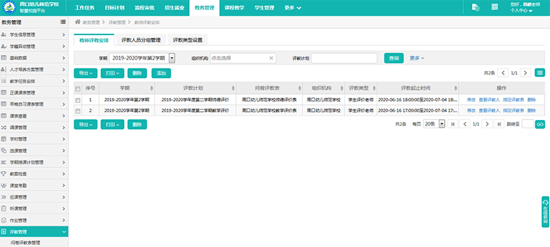 評(píng)教結(jié)果匯總統(tǒng)計(jì)一直都是一項(xiàng)繁雜的工作,遺漏、錯(cuò)統(tǒng)計(jì)都是時(shí)常發(fā)生的事情。周口幼師通過(guò)智慧校園平臺(tái)進(jìn)行評(píng)教,快速導(dǎo)出評(píng)教結(jié)果,總分、排名自動(dòng)匯總分析,學(xué)期評(píng)教成績(jī)一目了然,評(píng)教過(guò)程可視化,評(píng)教結(jié)果數(shù)據(jù)化,評(píng)教數(shù)據(jù)更加真實(shí),更能反饋問(wèn)題。師生可通過(guò)電腦、平板、手機(jī)App進(jìn)行評(píng)教,短短幾分鐘即可完成一次評(píng)教。以前需要好幾位老師共同組織才能完成的評(píng)教,現(xiàn)在學(xué)校只安排一位評(píng)教管理老師就能輕松完成評(píng)教工作。