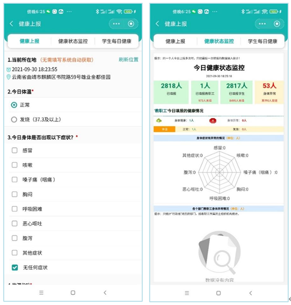 疫情反反復復,學校如何高效、準確地掌握師生健康情況,成為曲靖農(nóng)校有序推進校園疫情防控工作的關鍵所在。通過YN智慧校園App,全校師生可用手機迅速填報個人健康信息,系統(tǒng)實時統(tǒng)計每個師生的健康情況,健康狀態(tài)一目了然,管理者可據(jù)此及時研判防疫工作形勢,防患于未然。