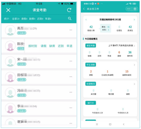 2017年,學校從制度到流程上完善了課堂考勤制度。依托依能智慧校園平臺,任課老師可在電腦或手機上對學生進行課堂點名考勤,班主任根據(jù)考勤推送信息及時清查考勤異常學生,強化了學生的安全管理。如果學生存在請假的情況,任課教師課堂考勤時,可以自動獲取請假信息,避免假條傳遞不及時而導致的考勤不準確。