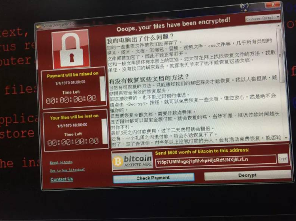 正由于以上特點(diǎn),在出現(xiàn)的當(dāng)天,該病毒就以迅雷不及掩耳之勢瘋狂攻擊了全球上百個(gè)國家,我國眾多行業(yè)的內(nèi)網(wǎng)網(wǎng)絡(luò)也被大規(guī)模感染。被感染的電腦文件被加密,只有支付贖金才能恢復(fù),勒索金額為300至600美元等值的比特幣。但是,很多人反映,即使支付了贖金,文件也并未恢復(fù)。