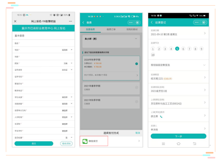 巴南職業(yè)教育中心的智慧校園平臺集成學(xué)生管理、教務(wù)管理、課程教學(xué)、招生就業(yè)等業(yè)務(wù)系統(tǒng),打破信息孤島,保障數(shù)據(jù)一致,助力學(xué)校提質(zhì)增效。招生迎新應(yīng)用實現(xiàn)了學(xué)生網(wǎng)上報名、數(shù)據(jù)快捷統(tǒng)計、學(xué)生網(wǎng)上繳費、迎新報到的高效便捷管理,有效解決了傳統(tǒng)報名繳費不便、現(xiàn)場排長隊等問題;教務(wù)管理應(yīng)用實現(xiàn)了排課、調(diào)課、聽課、巡課、考務(wù)、成績、課時統(tǒng)計的自動化管理,解放了教師的重復(fù)勞動力,提高教務(wù)管理水平和效率;學(xué)生管理應(yīng)用建立了學(xué)生事務(wù)一站式管理與服務(wù)平臺,解決現(xiàn)實中學(xué)生工作繁瑣、無序、低效的現(xiàn)狀。
