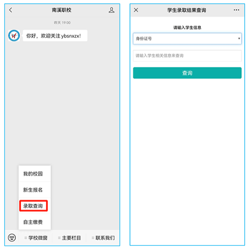 新生報(bào)名、繳費(fèi)成功后,學(xué)校人工審核、錄取學(xué)生,向?qū)W生發(fā)送錄取相關(guān)通知,學(xué)生通過(guò)微信公眾號(hào)查詢自己被錄取的相關(guān)信息。