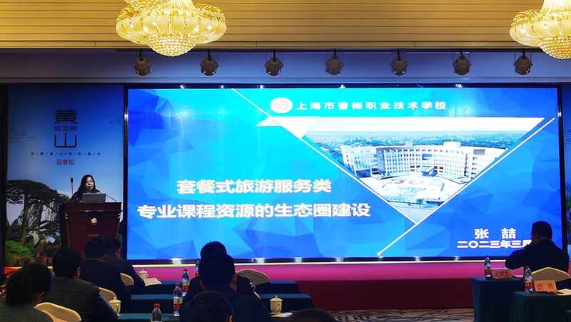 上海市曹楊職業(yè)技術(shù)學(xué)校副校長張喆首先作了題為《套餐式旅游服務(wù)類課程資源開發(fā)與應(yīng)用》的報告。她從生態(tài)圈建設(shè)思路、課程資源圈建設(shè)、混合式教學(xué)圈應(yīng)用、開放共享圈輻射等方面作了詳細的闡述。