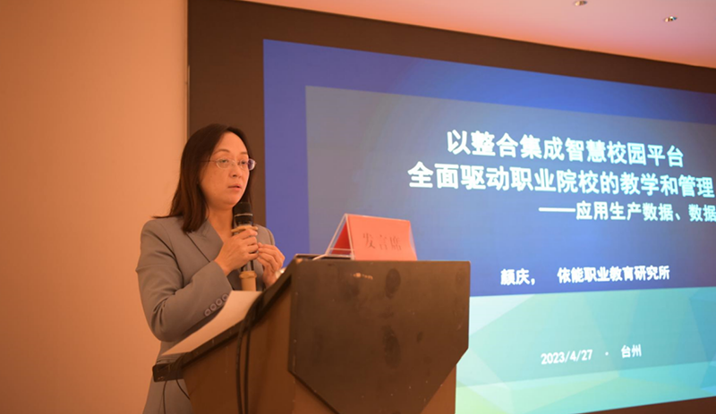 依能職業(yè)教育研究所研究員顏慶在會(huì)上作了題為《以整合集成的智慧校園平臺(tái)全面驅(qū)動(dòng)職業(yè)院校的教學(xué)和管理》的報(bào)告,從教育信息化的相關(guān)政策、整合集成的智慧校園平臺(tái)建設(shè)規(guī)劃、教學(xué)運(yùn)行PDCA閉環(huán)應(yīng)用與業(yè)務(wù)流程再造等三個(gè)方面分享了智慧校園建設(shè)的重點(diǎn)任務(wù)和建設(shè)方案。同時(shí),她提出只有全面提升干部和教職工隊(duì)伍的信息素養(yǎng)與信息技術(shù)能力,才能更好的通過信息化應(yīng)用推動(dòng)教學(xué)質(zhì)量和管理水平的持續(xù)提升。