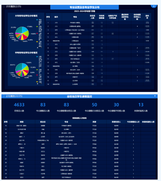 通過學(xué)生工作管理的智慧應(yīng)用,智慧校園平臺以學(xué)生在校期間行為表現(xiàn)、學(xué)習(xí)表現(xiàn)、過程評價(jià)、校園活動等實(shí)時(shí)數(shù)據(jù)為基礎(chǔ),比如個(gè)人學(xué)業(yè)分析及預(yù)警、學(xué)生課程成績表現(xiàn)、學(xué)生個(gè)人操行考核情況、學(xué)生出勤情況,進(jìn)行多維度數(shù)據(jù)分析,形成學(xué)生在校期間的大數(shù)據(jù)。曲靖財(cái)經(jīng)學(xué)校管理部門和老師可通過顯示屏或手機(jī)實(shí)時(shí)查看相關(guān)信息,第一時(shí)間掌握學(xué)生動態(tài)數(shù)據(jù),及時(shí)跟進(jìn)加強(qiáng)管理,調(diào)整教育教學(xué)行為,實(shí)現(xiàn)教學(xué)質(zhì)量的品質(zhì)提升。