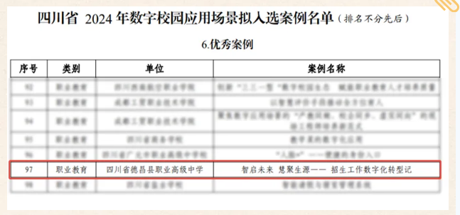 近日,四川省教育廳發(fā)布《關(guān)于開展2024年數(shù)字校園應(yīng)用場景典型案例評選》通知,經(jīng)過專家組的嚴(yán)格評審,四川省德昌縣職業(yè)高級中學(xué)(以下簡稱“德昌職中”)的《智啟未來,慧聚生源——招生工作數(shù)字化轉(zhuǎn)型記》項(xiàng)目成功入選"四川省2024年數(shù)字校園應(yīng)用場景典型案例"之“優(yōu)秀案例”。作為成都依能科技股份有限公司的用戶之一,德昌職中的此次成功入選,不僅是對該校在數(shù)字校園建設(shè)領(lǐng)域積極探索與創(chuàng)新實(shí)踐的認(rèn)可,同時(shí)也充分展現(xiàn)了依能在推動(dòng)職業(yè)院校實(shí)現(xiàn)數(shù)字化轉(zhuǎn)型方面的能力。