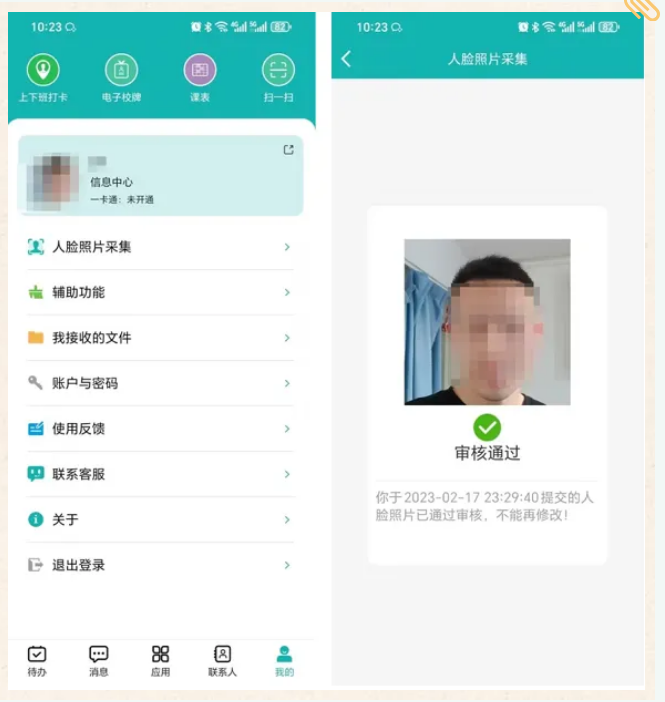全校師生在YN智慧校園App上使用手機自助采集人臉照片。學生人臉由班主任、學生科、信息管理人員三級審核,確?!叭苏找恢隆x容樸素、符合規(guī)格”。審核合格的人臉照片,將被發(fā)送到智慧校園平臺集中存儲,并自動生成特征庫加密,有效保障了人臉數(shù)據(jù)的安全性和準確性。