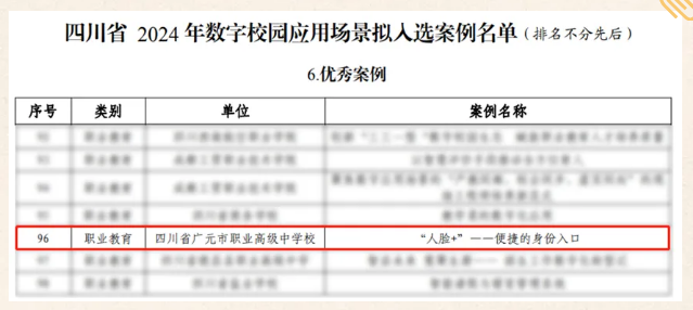 近日,四川省教育廳發(fā)布《關于開展2024年數(shù)字校園應用場景典型案例評選》通知,經(jīng)過專家組的嚴格評審,四川省廣元市職業(yè)高級中學校(以下簡稱“廣元職高”)的《“人臉+”——便捷的身份入口》項目成功入選四川省2024年數(shù)字校園應用場景典型案例中的優(yōu)秀案例,這也是該校連續(xù)兩年在此類評選中脫穎而出。