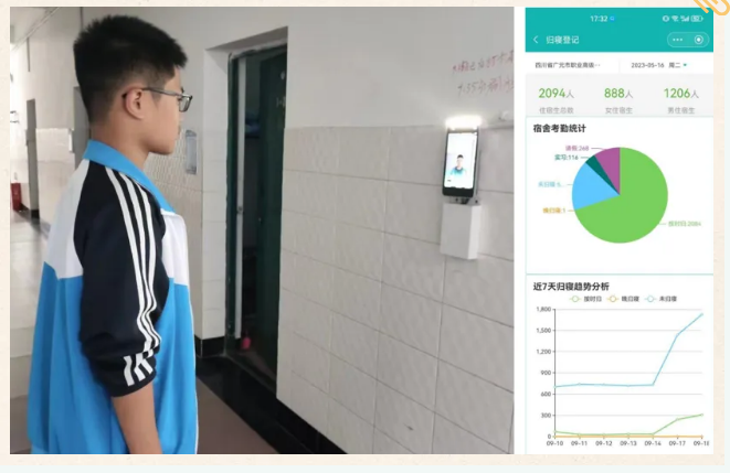 學校在宿舍樓出入口、各宿舍樓層安裝依能人臉考勤機,學生每晚就寢前“刷臉”。在各教室和實訓室門口安裝帶有攝像頭的依能電子班牌,學生到位時“刷臉”簽到。智慧校園考勤系統(tǒng)自動記錄、計算學生考勤數(shù)據(jù),及時提醒老師或向責任人預警,解決了紙質點名效率低下、學生混淆等導致的考勤不精準等問題。